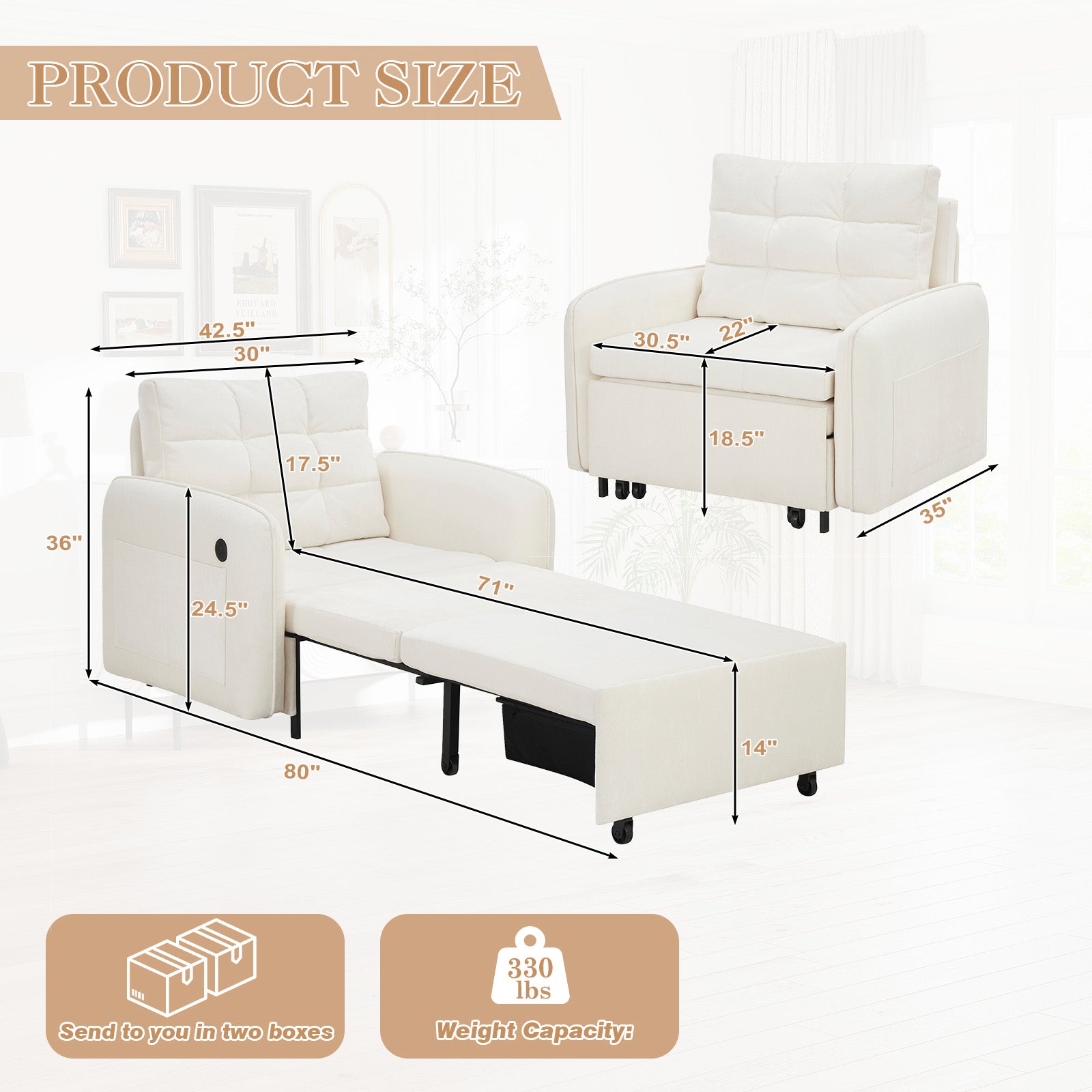 3-in-1 Space Saving Design: Easily converts from a comfortable chair to a relaxing chaise lounger, and finally into an 80" extra-long single sleeper bed—perfect for small spaces.