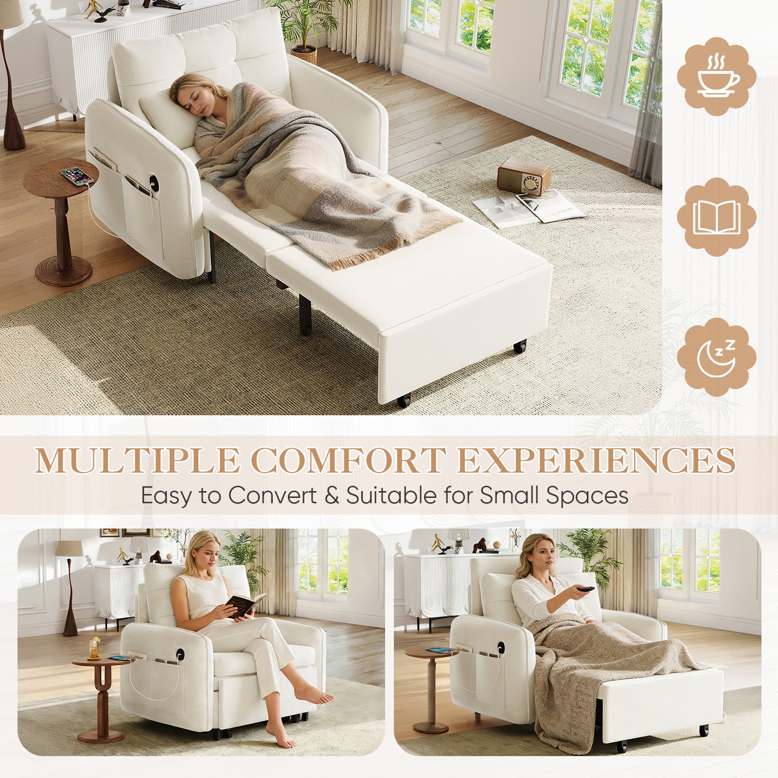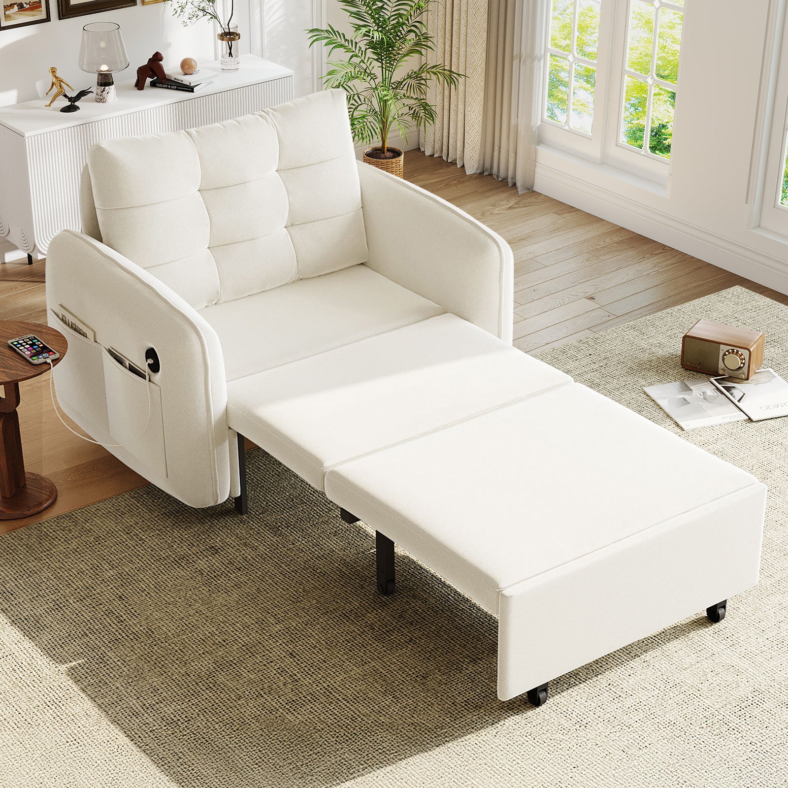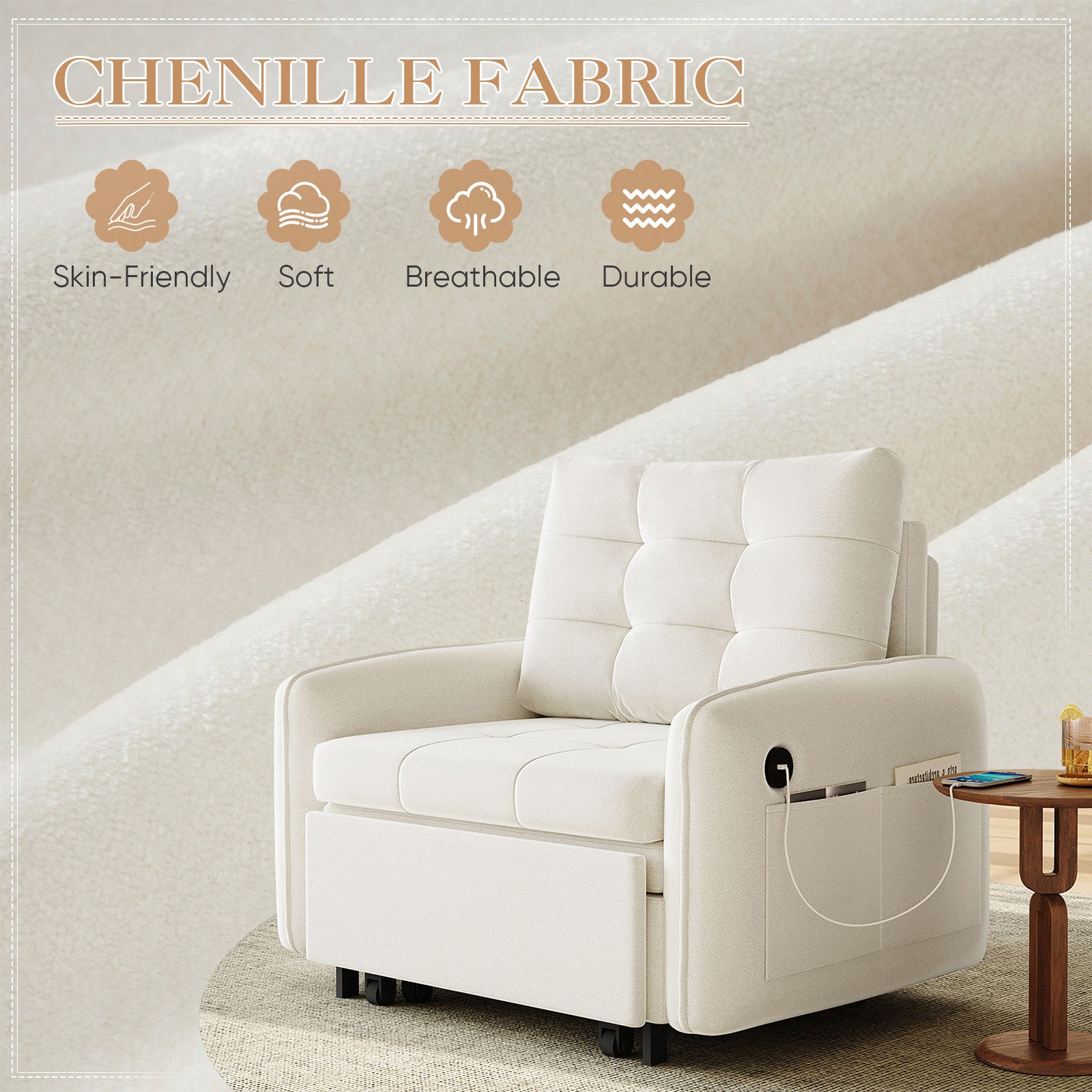 Meet your space’s new best friend: a 3-in-1 sleeper chair that transforms to fit your life. Perfect for apartments, dorms, studios, or living room corners, this multi-functional pull out sofa bed combines smart design with everyday comfort. In its compact chair form, it’s a cozy spot for sitting. Pull it out once to relax in lounge mode, or extend it fully into an extra-long single sleeper bed for naps or overnight guest. Crafted in soft, durable chenille fabric with thoughtful touches like built-in USB & Type-C charging ports, side pockets, and a hidden under-bed storage box, it’s the versatile solution for modern living.