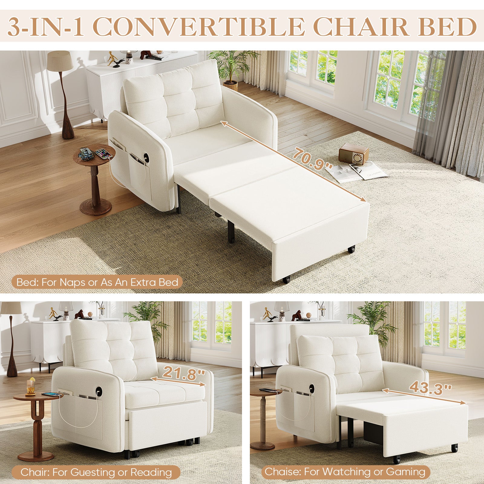 3-Levels Adjustable Depths: Customize your comfort with three locked positions: Chair (21.8" seat depth), Lounger (43.3" seat depth), and Bed (70.9" seat depth).