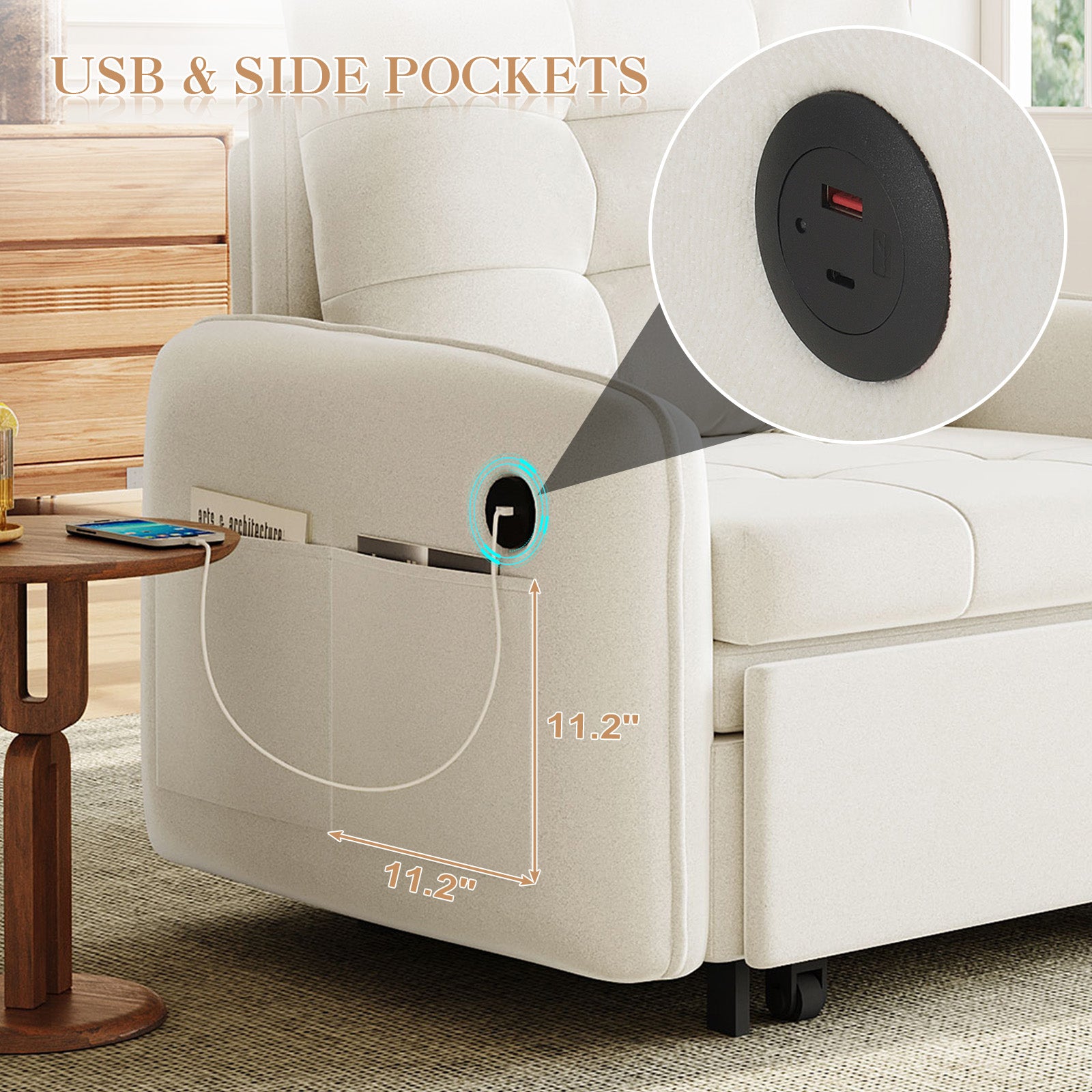 USB & Side Pockets: Features both USB and Type-C ports on the armrest for convenient device charging, plus handy storage pockets for remotes or small essentials.
