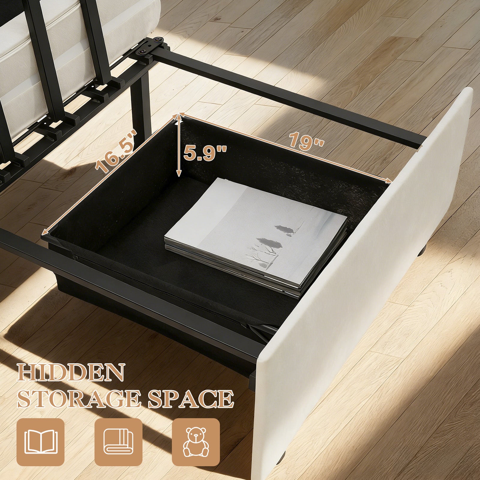 Hidden Under-Bed Storage: A spacious storage box is revealed when extended, ideal for stashing bedding, pillows, or personal items to keep your area tidy.