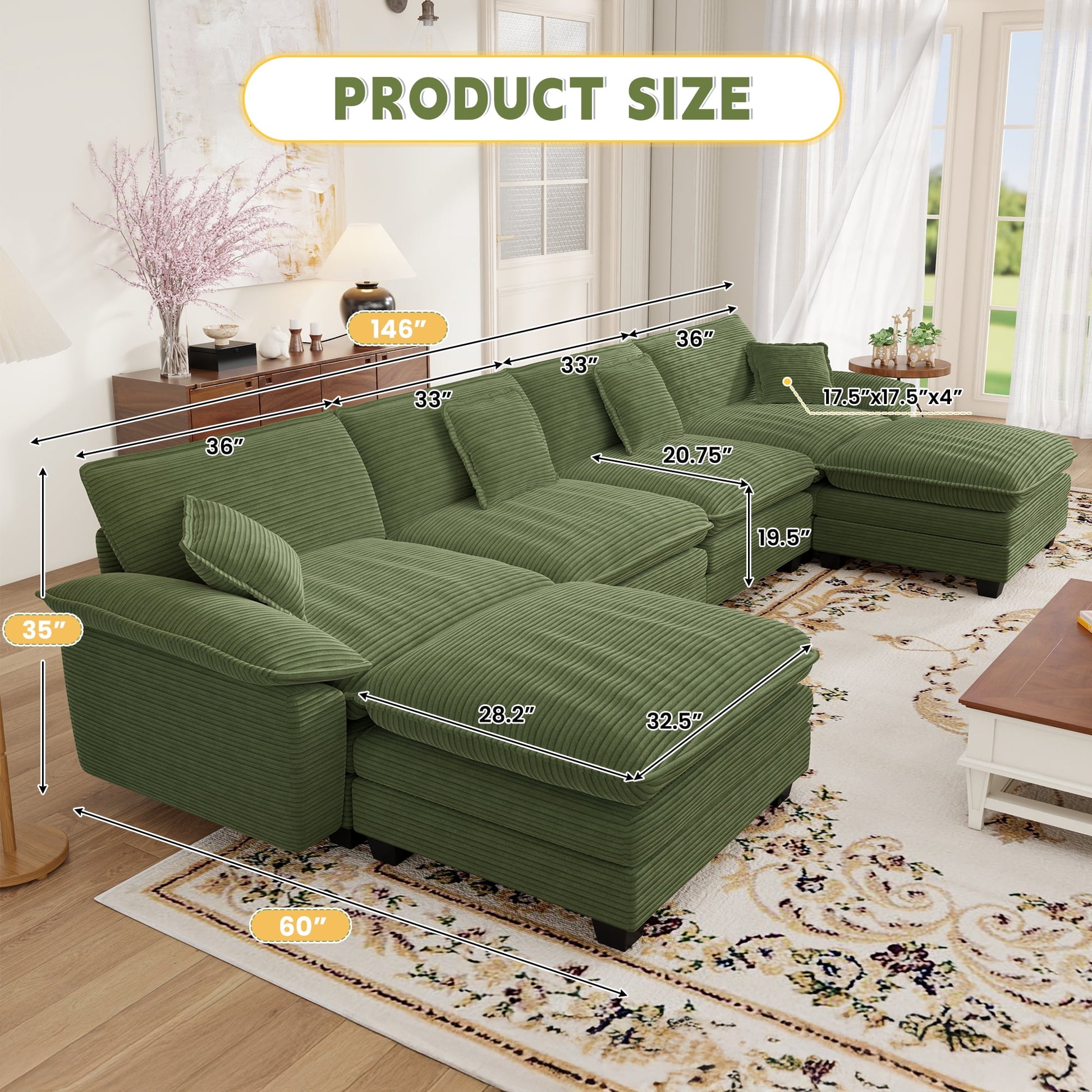 Are you looking for a Comfortable Couch for your family? If so,this Muumblus U shape modular sectional sofa with 2 Reversible Ottoman and double layer cushions is highly recommended to you. When you sit on the seat, the soft and delicate cushion will bring you a comfortable feeling as if you were on a cloud. reversible ottoman can also be used as a separate footstool or coffee table depending on the situation. Whether you put it in apartment, living room or even parlor, the beauty and comfort it will bring you are certain.
