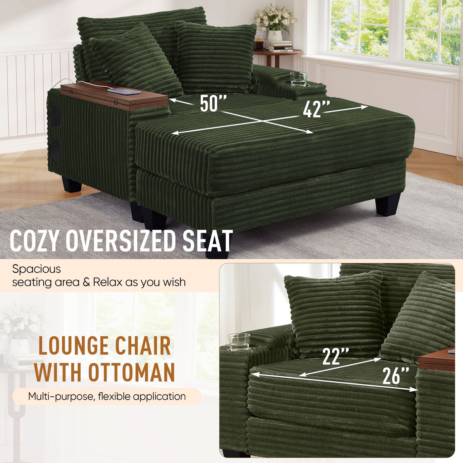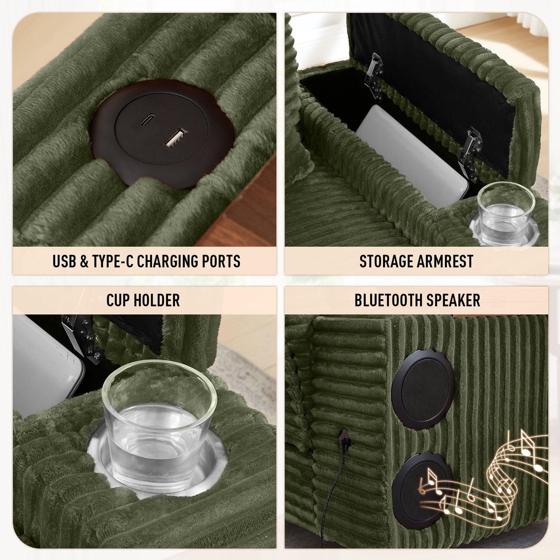 Experience ultimate comfort and practicality with this multifunctional lounge sofa chair, designed for modern living. Upholstered in luxurious corduroy for softness and durability, it includes a ottoman that doubles as a footrest, extra seating, or a table. It is equipped with a Bluetooth speaker, allowing you to listen to music anytime while enjoying the comfortable chair. The built-in swivel table on the armrest easily rotates for use as a desk or tray. Stay organized with discreet storage under the armrest, and enjoy added convenience like a USB port, and a cup holder to keep drinks secure. Perfect for any room, this sofa combines elegant design with everyday functionality—making it the ideal choice for relaxation and smart living.